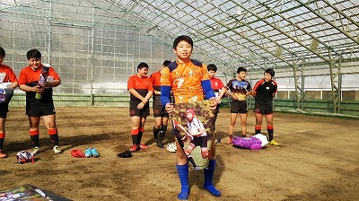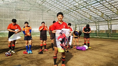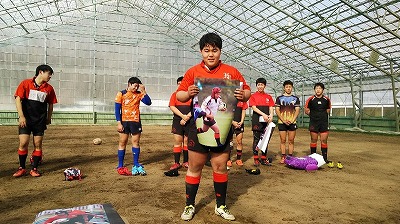 毎年、宮崎コーチが作製してくださる大型サイズの記念写真とメンバーとコーチから寄せ書きされたマスコットボールが授与されました。 |